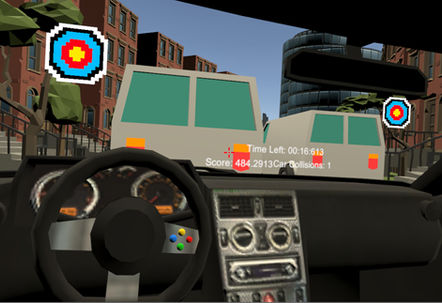 VR driving game testing if players can drive and play a target shooting game at the same time. A score is given based on number of targets hit and driving performance. The goal was to learn how to develop VR applications in Unity 3D and test different controller inputs.